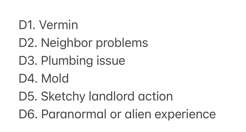 • d. Roll on the following d6 table to determine what might be going wrong with your rented house: